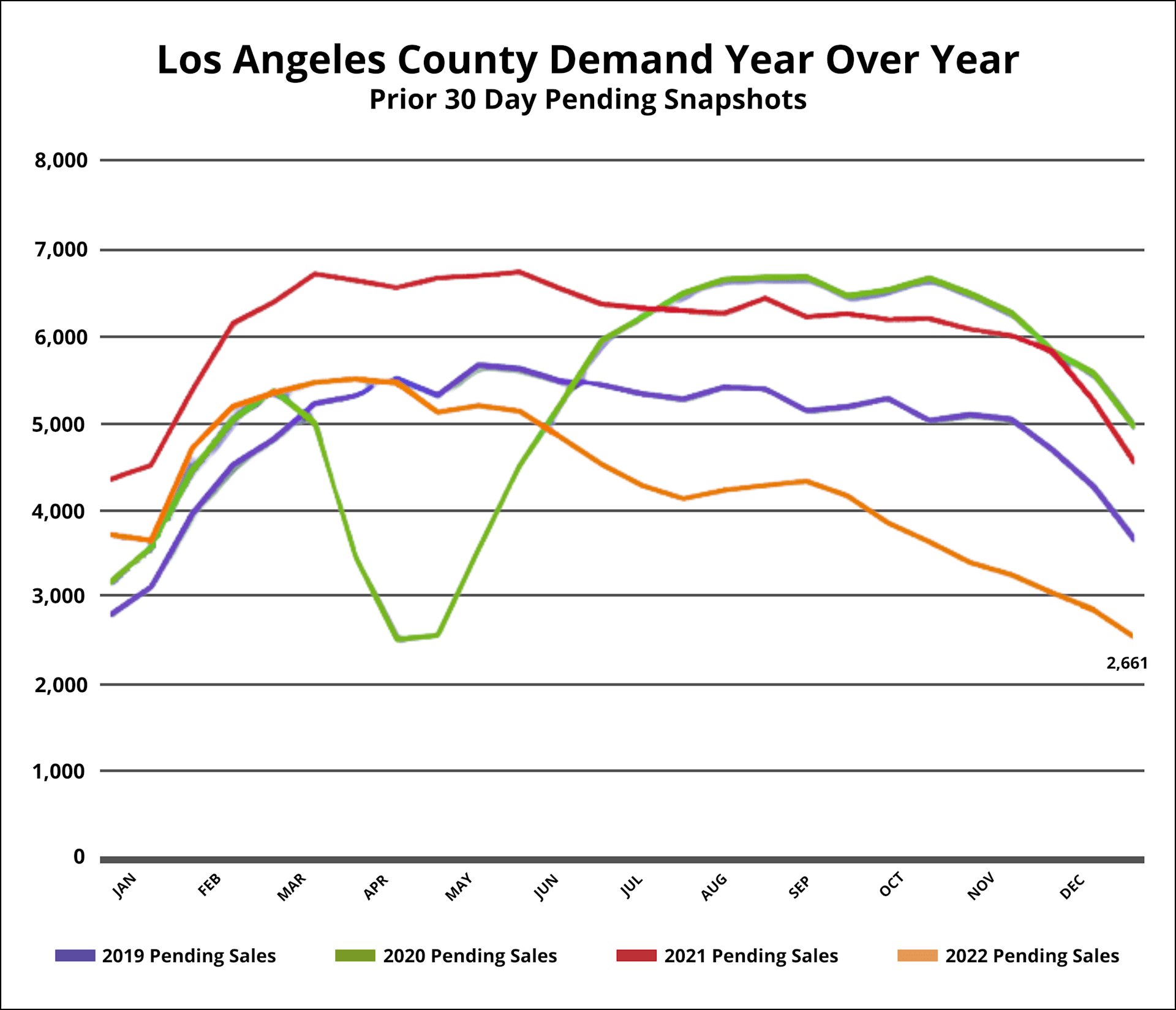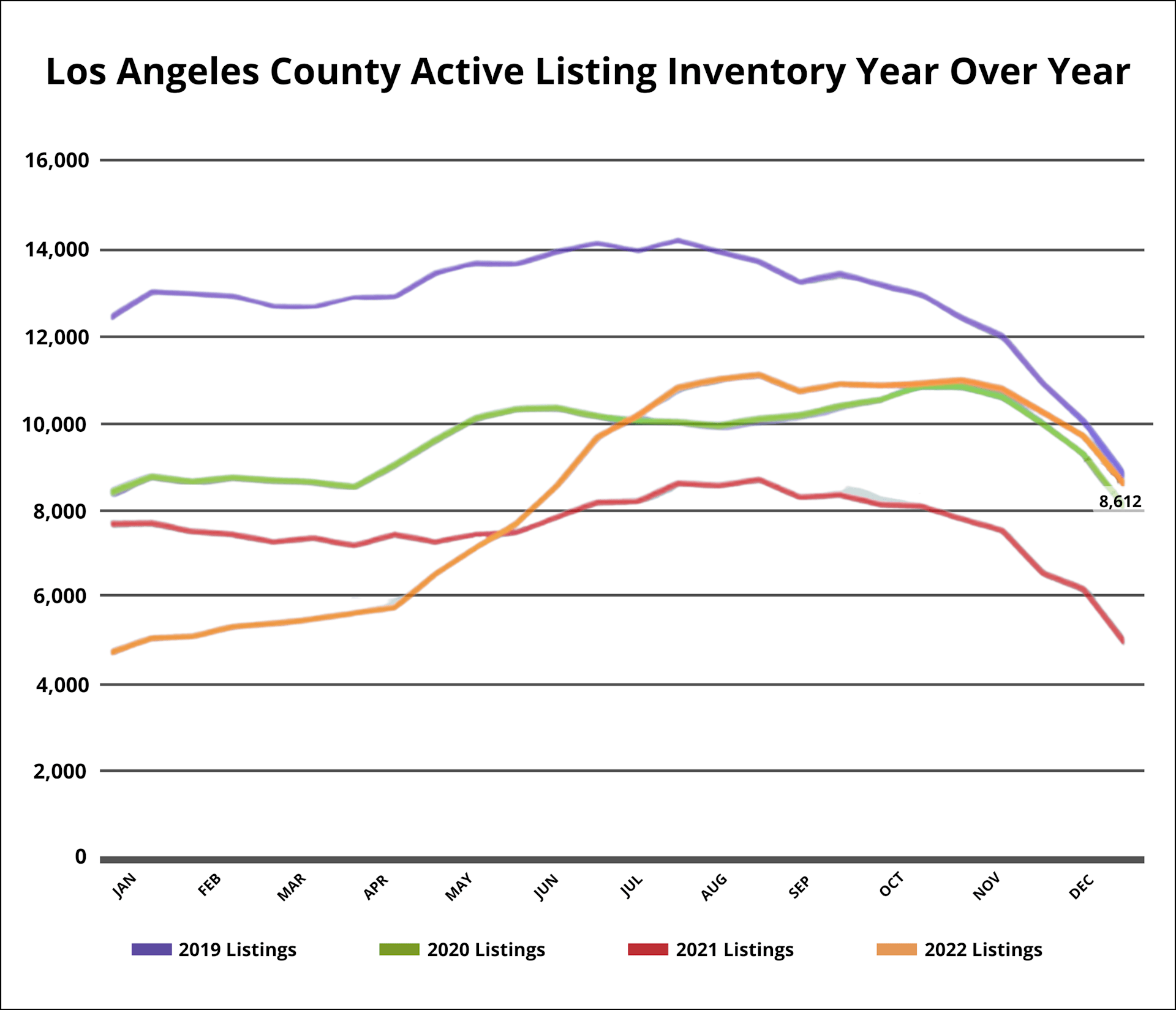 Demand, within the past two weeks, dropped by 169 pending sales, or 6%, and now sits at 2,661 pending sales, the lowest reading since April 2020, and the lowest level for an end to December since tracking began in 2012. Last year at this time, demand was at 4,551 pending sales, or 71% higher. The 3-year average end to December prior to COVID was 3,542 pending sales, or 33% higher. The active listing inventory at the year’s end decreased to 8,612. The 3-year average peak prior to COVID (2017 to 2019) was 13,909 homes, 25% higher than this year.