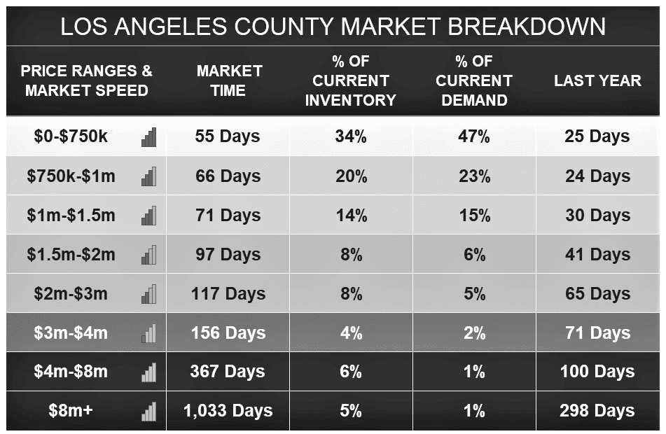 The Expected Market Time for properties with prices ranging from $2 million to $3 million has reduced from 223 days to 117 days over the course of the last few weeks. For houses valued between $3 million and $4 million, it fell from 289 days to 156 days over this time period. The Expected Market Time dropped from 434 to 367 days for properties with prices ranging from $4 million to $8 million. The number of days on the market that is anticipated for properties with prices higher than $8 million rose from 766 to 1,033. If a seller waits 1,033 days, they won't be able to put their house up for sale until December 2025 at the earliest.