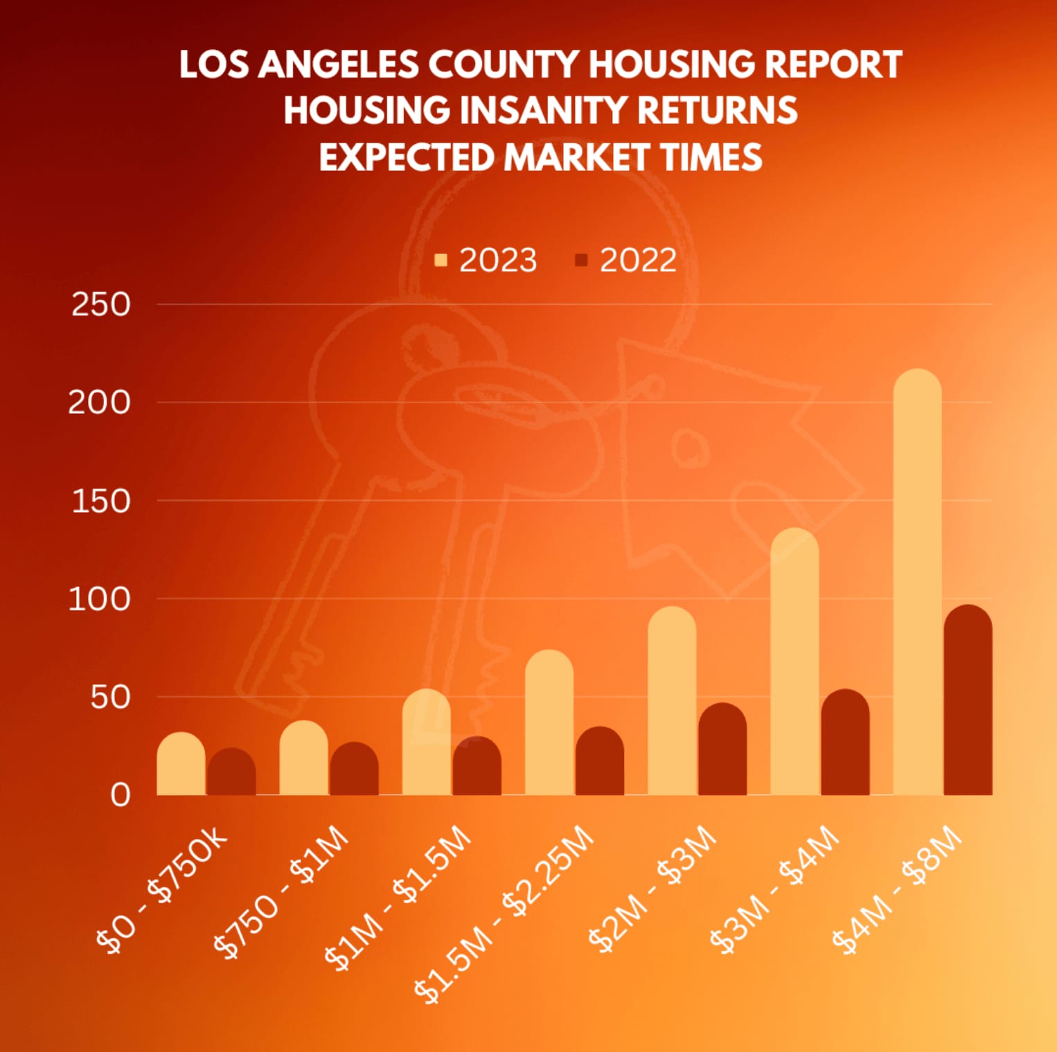 - For homes priced between $2 million and $3 million, the Expected Market Time in the past couple of weeks remained unchanged at 96 days. For homes priced between $3 million and $4 million, the Expected Market Time remained unchanged at 136 days. For homes priced between $4 million and $8 million, the Expected Market Time decreased from 276 to 217 days. For homes priced above $8 million, the Expected Market Time decreased from 1,341 to 1,302 days.
