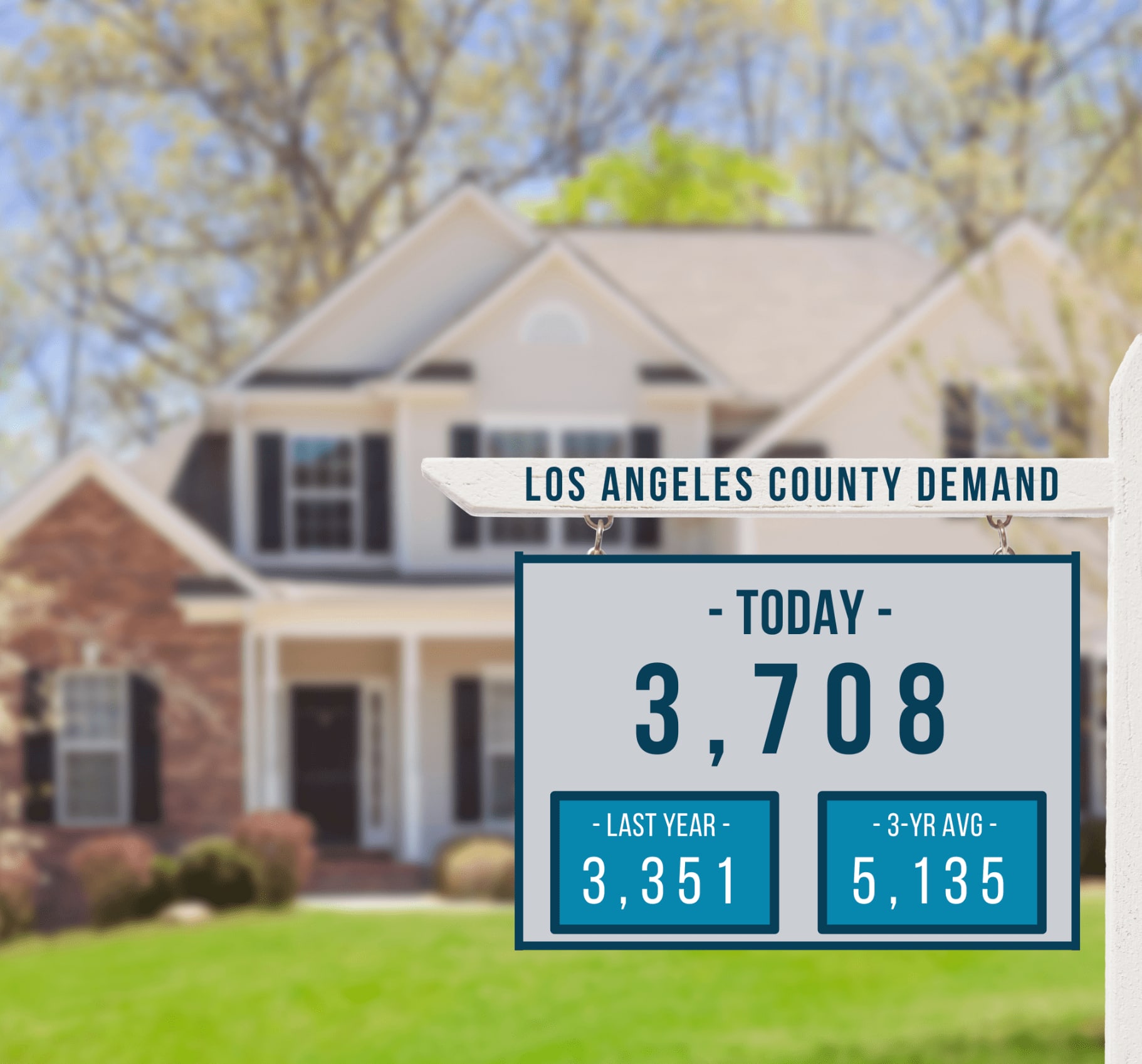 - Distressed homes, both short sales and foreclosures combined, made up only 0.7% of all listings and 0.9% of demand. Only 54 foreclosures and 26 short sales are available to purchase today in all of Los Angeles County, with 80 total distressed homes on the active market, down three from two weeks ago. Last year, there were 48 total distressed homes on the market, slightly fewer than today.