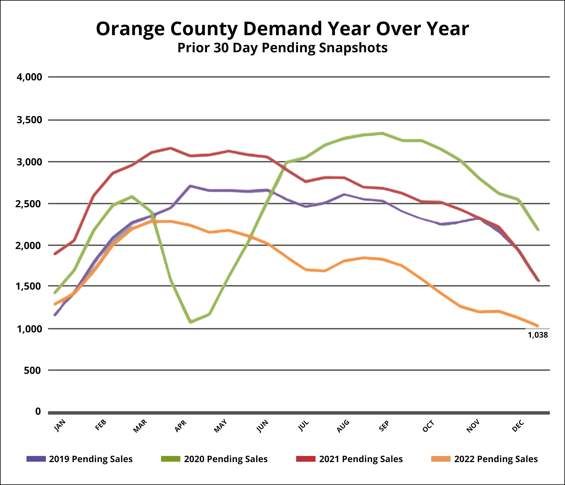 Demand, within the past two weeks, dropped by 95 pending sales, or 8%, and now sits at 1,038 pending sales, the lowest reading since January 2008, and the lowest level for an end to December since tracking began in 2004. Last year at this time, demand was at 1,591 pending sales, or 53% higher. The 3-year average end to December prior to COVID was 1,499 pending sales, or 44% higher. The active listing inventory at the year’s end decreased to 2,642. The 3-year average peak prior to COVID (2017 to 2019) was 6,959 homes, 71% higher than this year.