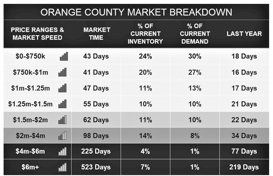 The Expected Market Time for properties with prices ranging from $2 million to $4 million has reduced from 116 days to 98 days over the course of the last few weeks. For houses valued between $4 million and $6 million, it fell from 245 days to 225 days over this time period. The Expected Market Time dropped from 882 to 523 days for properties priced higher than $6 million. If a seller waits 523 days, they will likely have to consider putting their house up for sale in escrow sometime around July 2024.