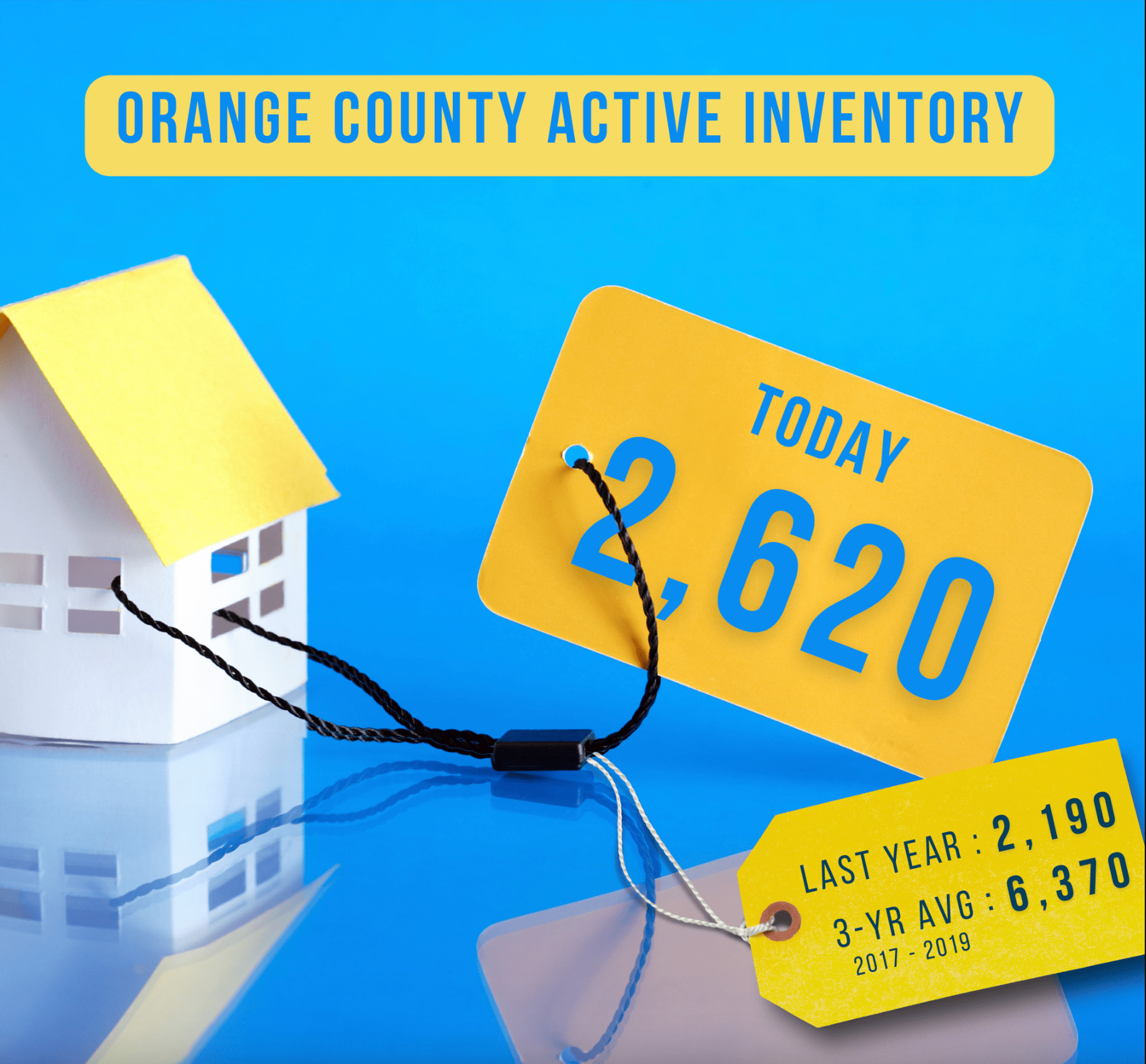 - Distressed homes, both short sales and foreclosures combined, comprised only 0.2% of all listings and 0.2% of demand. Only five foreclosures and one short sale are available today in Orange County, with six total distressed homes on the active market, up one from two weeks ago. Last year, 14 distressed homes were on the market, similar to today.