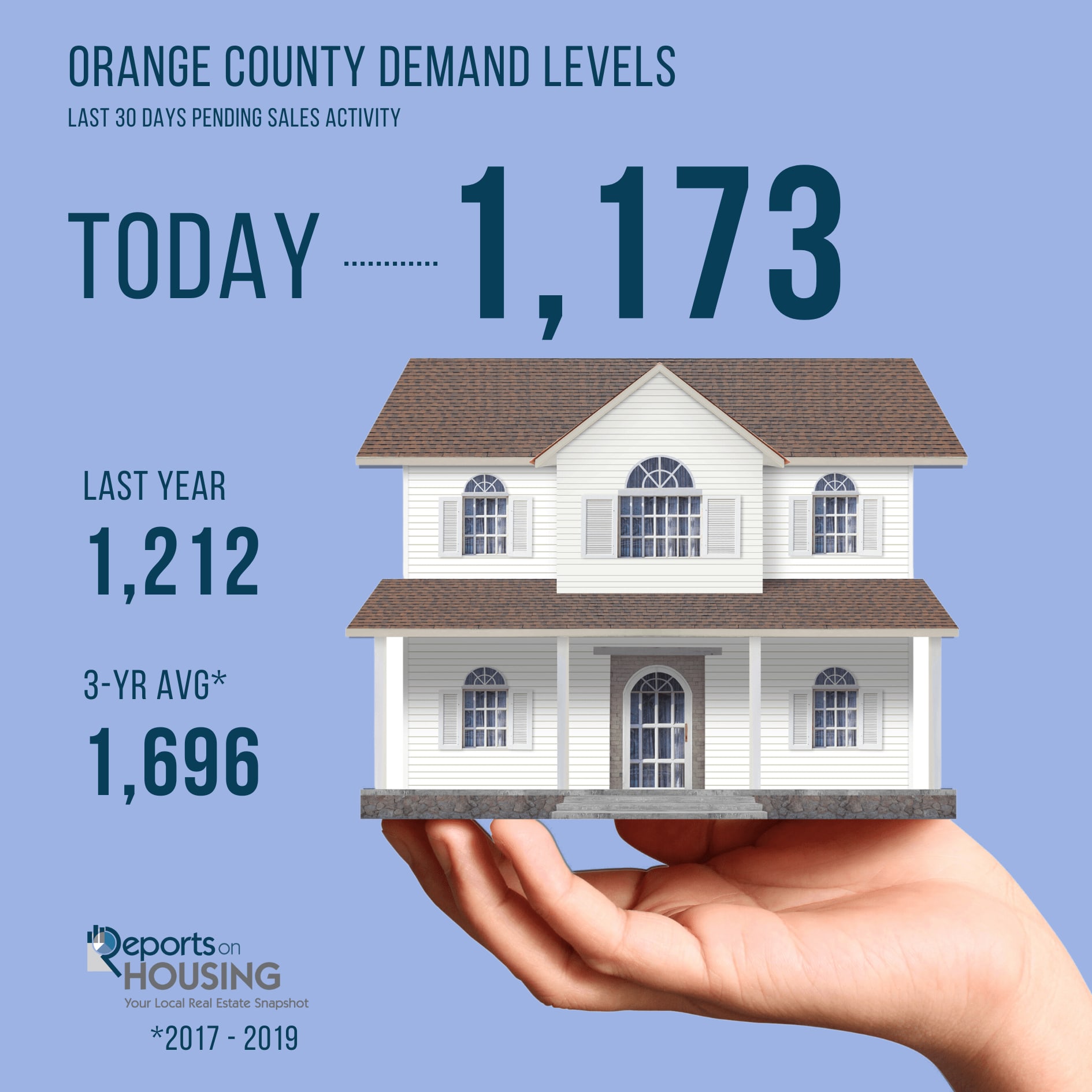 - Distressed homes, both short sales and foreclosures combined, comprised only 0.3% of all listings and 0.1% of demand. Only six foreclosures and two short sales are available today in Orange County, with eight total distressed homes on the active market, up two from two weeks ago. Last year, eight distressed homes were on the market, identical to today.