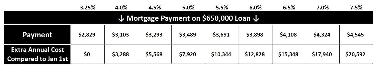 The table shows a sample mortgage payment on a $650,000 loan with 10% down. At the beginning of the year, you are looking at $2,829/month. And at 7% you're looking at $4,324/month. This is a difference of roughly $18,000/year which is pretty significant, especially for median incomes.