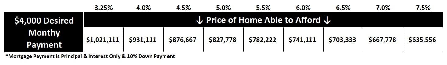 The table shows a decline in purchasing power caused by rising rates. At the beginning of the year, you can afford a $1,021,111 home with a 10% down at 3.25%. But at 7.0%, you can only purchase a $635,556 house.