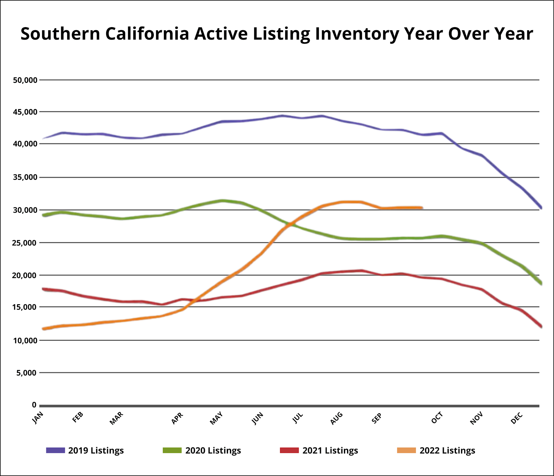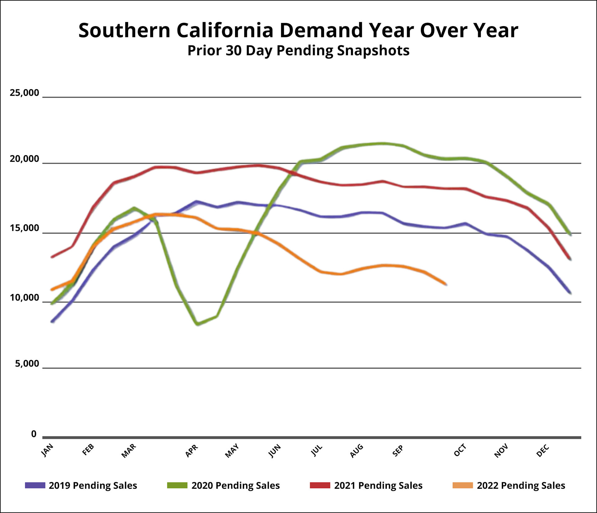 Everything has slowed down considerably. The left graph shows less pending activity today compared to the three–year average prior to Covid. As interest rates continue to climb all the way up to 7% earlier this week, definitely has an impact on the number of properties that have gone into escrow. (The last two weeks are the largest drop since the start of July last year, we were 18,150 at this time, which was 62% higher than where we are today. And the three-year average is 14,840, still 32% higher.) High rates are definitely putting pressure on demand which has allowed more homeowners that are coming on, where they're languishing a little bit longer, aren't selling this quickly and they accumulate over time.